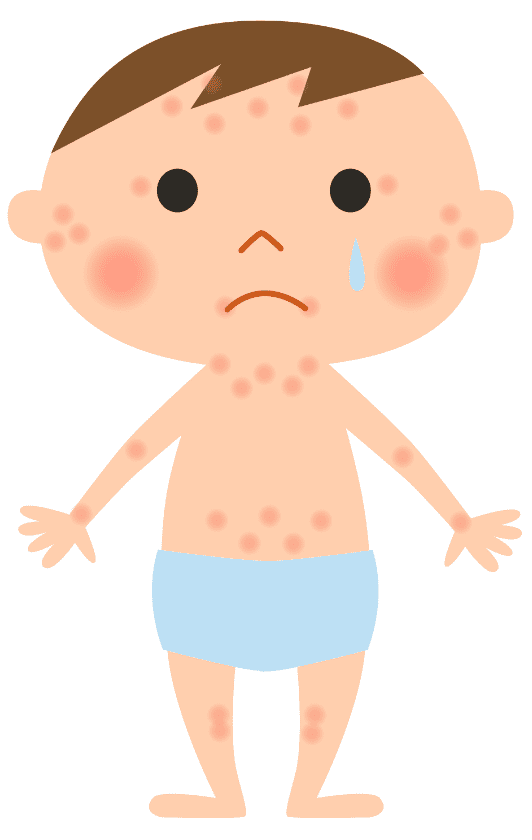 皮疹は強いかゆみを伴い、全身のどこにでもできますが、外的要因(よだれ、食物など)が加わる部位には早くまたは強く現れます。